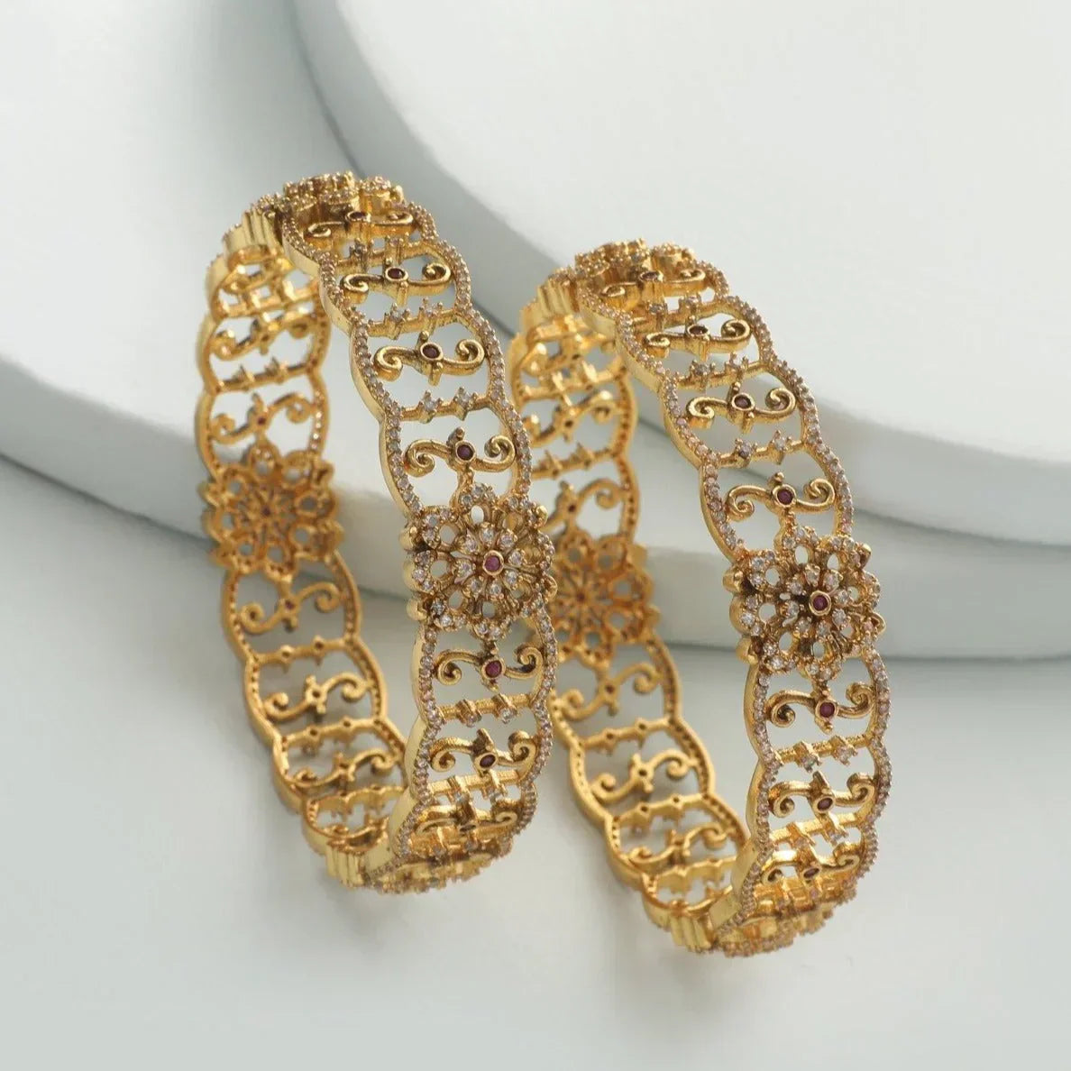 A brilliant fusion of chic and style , this piece festive edits will be a smart addition to your personal collection. This statement floral bangle is handcrafted in antique gold base and studded with shimmering CZ stones to elevate the fineness of the intricate designs and make the look more elevated.