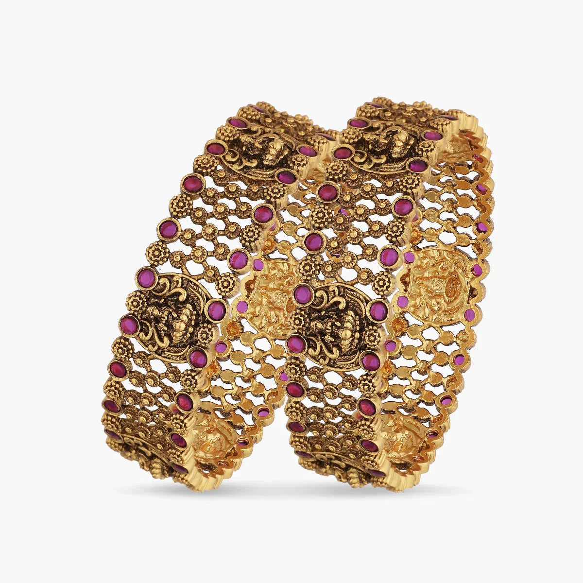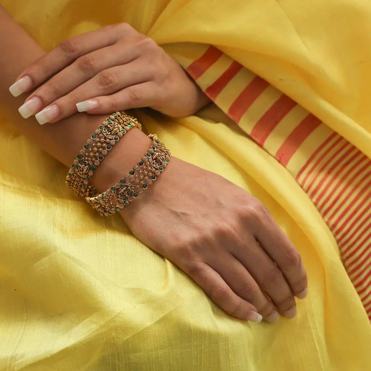 Handcrafted with premium antique gold plating, this bangle displays the intricacy of Goddess Laxmi in blessing posture to fill your day with a poise vibe. Featuring floral motifs and shining CZ stones these bangles are perfect to add a glimmering touch to your favorite evening party wear.
