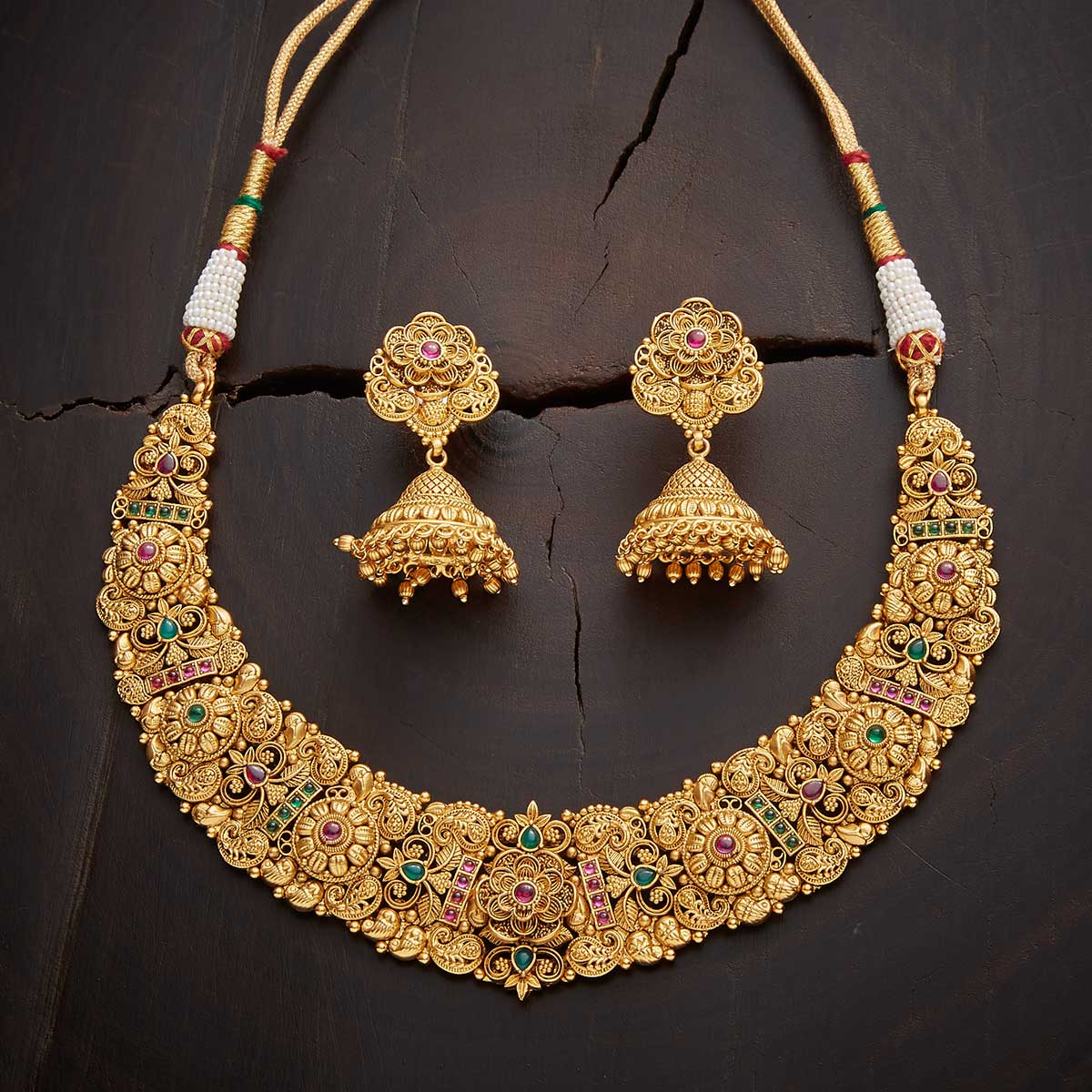 Base Metal: Copper Alloy Stone: Synthetic Stones Product Weight (gms): 81 Earring Weight: 29 Earring Length (cms): 5 Earring Style: Jhumkas Earring Closure Type: Push Back Product Details: Adjustable Thread