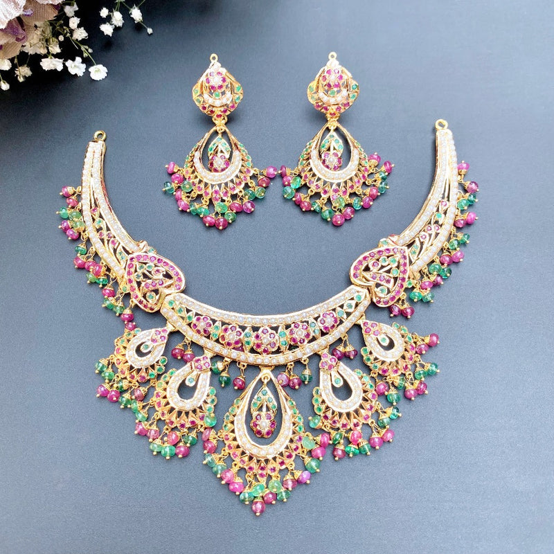 Featuring a beautiful jadau necklace and embellished with rubies, emeralds and pearls.