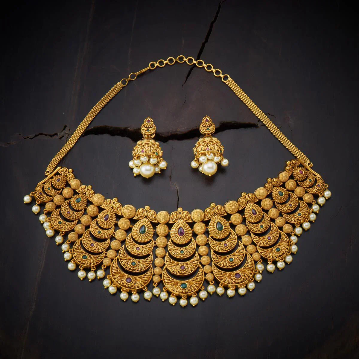 Base Metal: Copper Alloy Stone: Synthetic Stones & Beads Product Weight (gms): 139 Earring Weight: 25 Earring Length (cms): 4 Earring Style: Jhumkas Earring Closure Type: Push Back Product Details: Adjustable Chain